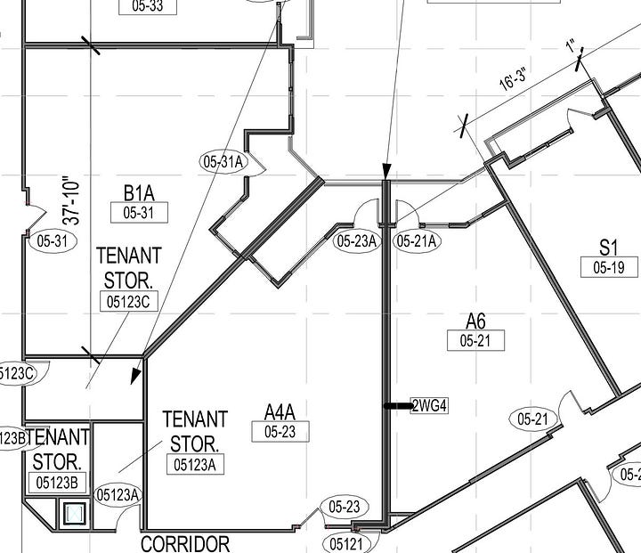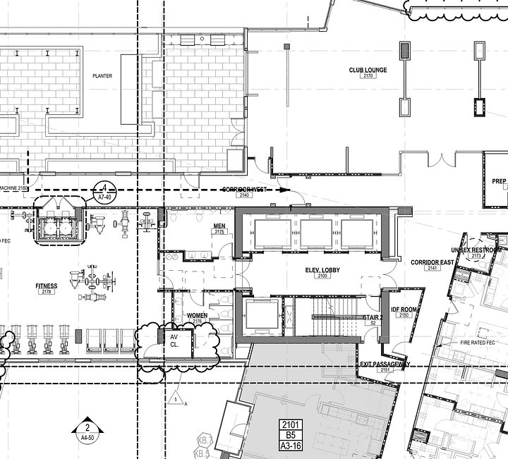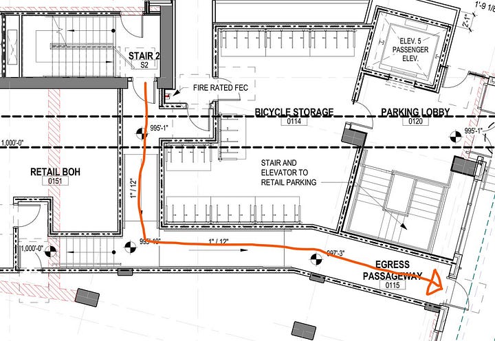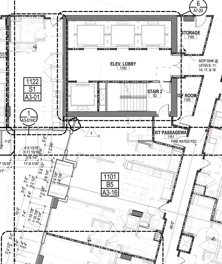 This is the opposite corner. Banking all of our elevators, structural core, and stair together, we were able to basically use up all the inefficient space. Still ended up with 1 storage unit on every floor. Which in this project rented out quick. Renters are weird. The core also worked really well on the top floor, where we could exit both ways for amenities.