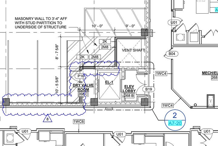 Inside corners need a lot of attention, or you will lose efficiency. Take this project, where we had to plan for elevator core locations, for multiple schemes (A wrap, a podium), locate shear walls, exit stairs, and coordinate with an existing grid. This was SDs.